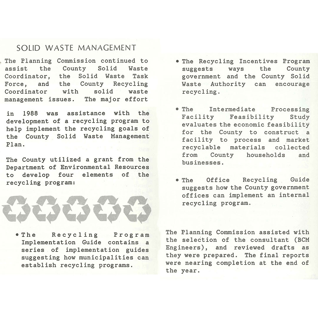 Back in 1988, Chester County took its first big sustainability steps! With support from a DEP grant, the county developed a new recycling program that included implementation guides for municipalities, recycling incentives, exploring a processing‑facility, and an Office Recycling Guide.