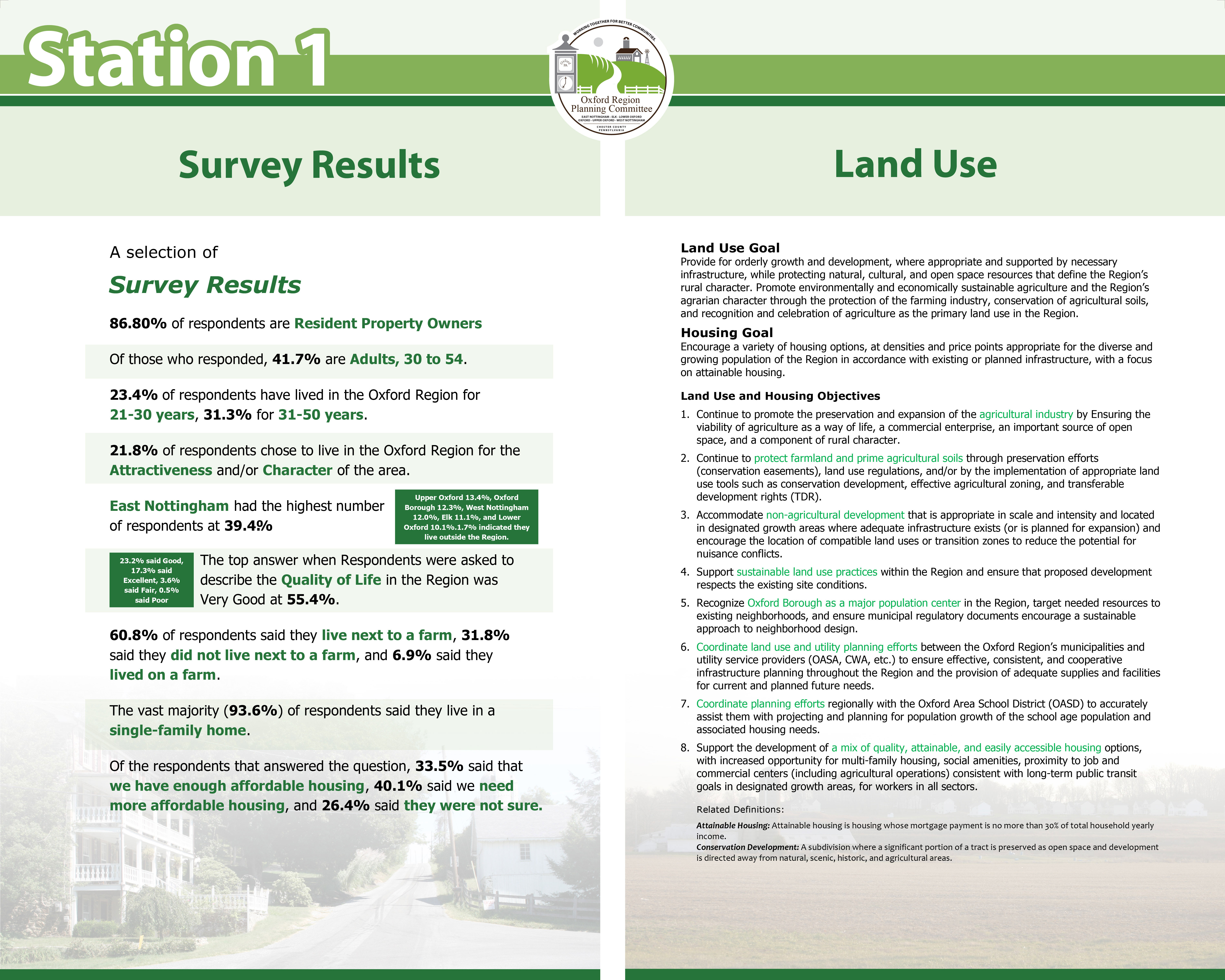 On May 28th, the ORPC held a Public Open House to gather public feedback on the Public Survey results and draft Plan Goals and Objectives. Nearly 40 residents participated in the Open House which was held the Penn’s Grove Middle School cafeteria. To find out what transpired, review the meeting report. View one of the display boards from the Open House that includes a sampling of the Survey results and draft goals and objectives for Land Use and Housing.